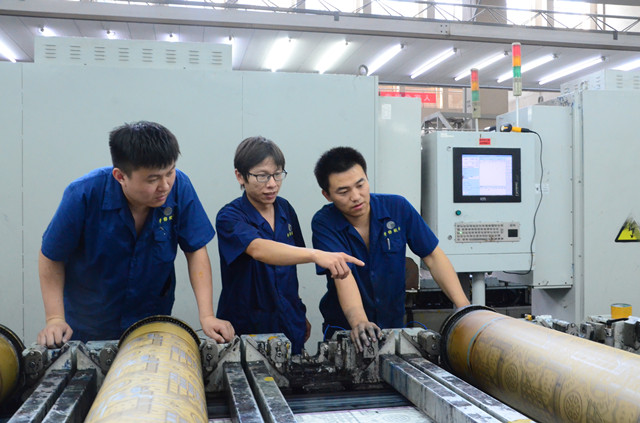 圖為輪班長張楠楠(中)與本班兩位印花機擋車工,在現場討論質量改進的情形。