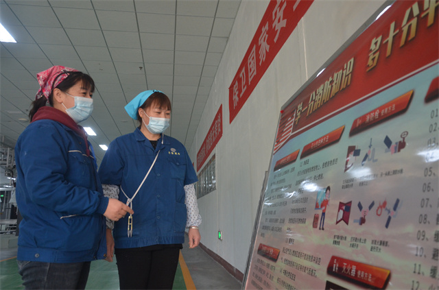 圖為公司家紡成品車間單針班兩名員工,在消防宣傳內容前交流的情形。