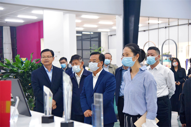 楊菡一行首先參觀了公司智云中心、服裝面料公司、花布公司、家紡公司、創意中心、工程技術研究院等,盛守祥向楊菡一行介紹了公司整體發展、智能制造、轉型升級等情況。