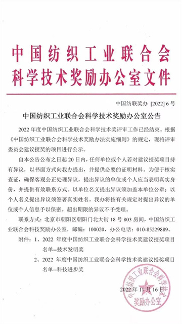 導讀:中國紡織工業聯合會向社會公示了“2022年度科學技術獎授獎項目名單”,公司“全流程印染過程數字化控制技術研究與應用示范”成果,獲得全國紡織行業2022年度技術進步獎二等獎。
