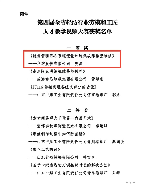 近日,山東省輕工紡織工會委員會組織開展的第四屆全省輕紡行業勞模和工匠人才教學視頻大賽評比結果揭曉,經專家評審和網上公眾投票,評出一等獎3名、二等獎4名、三等獎5名、優秀獎7名。公司電氣車間儀表技術員姜磊報送的《能源管理EMS系統流量計通訊故障排查維修》項目榮獲大賽一等獎。