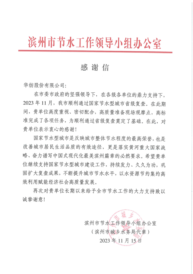 導讀:近日,濱州市節水工作領導小組辦公室向公司發來一封感謝信,