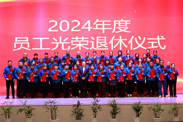 會上,為2024年度退休的員工舉辦了光榮退休儀式。公司黨委委員、紀委副書記、副總經理孫玉濤宣讀了2024年度退休員工名單;黨委書記、董事長盛守祥為退休員工代表頒發榮譽證書;退休員工張炳營代表67位退休員工作退休感言。
