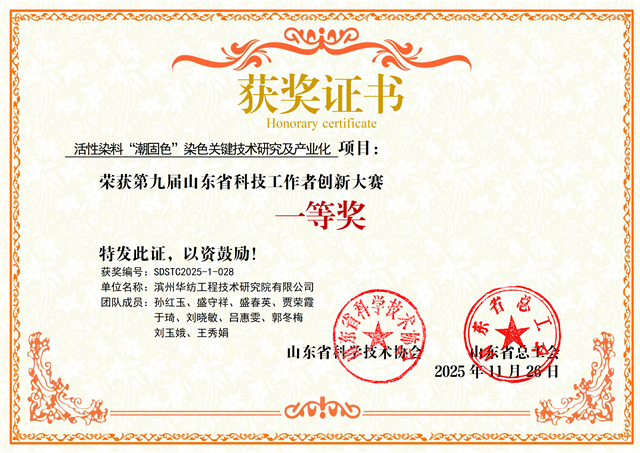 近日,在第九屆山東省科技工作者創(chuàng)新大賽決賽中,公司工程技術(shù)研究院團隊研發(fā)的“活性染料‘潮固色’染色關(guān)鍵技術(shù)研究及產(chǎn)業(yè)化”項目,經(jīng)多輪嚴(yán)格評審,從282個入圍決賽的優(yōu)秀項目中脫穎而出,榮獲大賽一等獎。