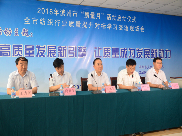 9月5日,2018年濱州市“質(zhì)量月”活動啟動儀式暨全市紡織行業(yè)質(zhì)量提升對標學(xué)習(xí)交流現(xiàn)場會在公司科技產(chǎn)業(yè)園舉行,會議由市政府秘書長尹月林主持,副市長、公安局長趙永生,市質(zhì)監(jiān)局黨委書記商新生,濱城區(qū)副區(qū)長鄭同忠,公司黨委書記、董事長王力民出席啟動儀式。